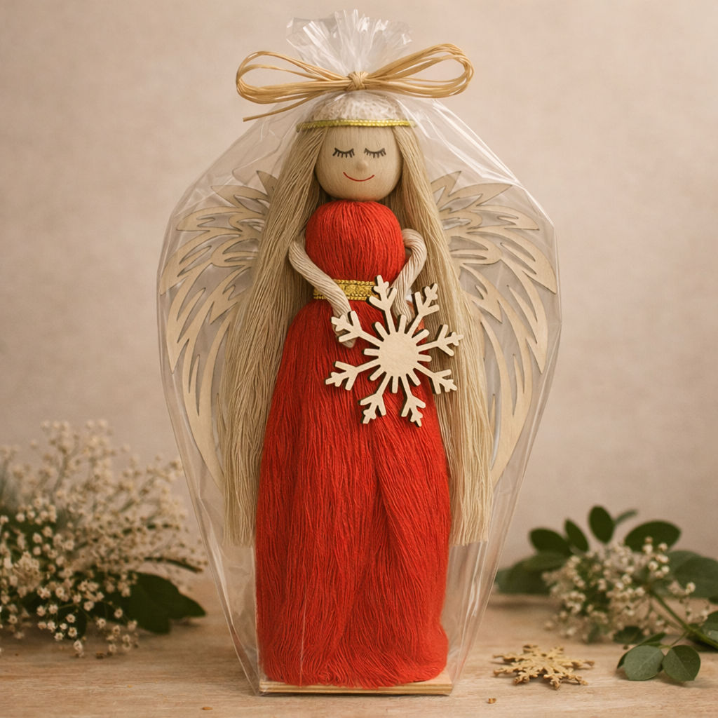 Ubrany w długą, czerwoną suknię, z drewnianymi skrzydłami i śnieżynką w dłoniach, przypomina o spokoju i wdzięczności, które niosą Święta.