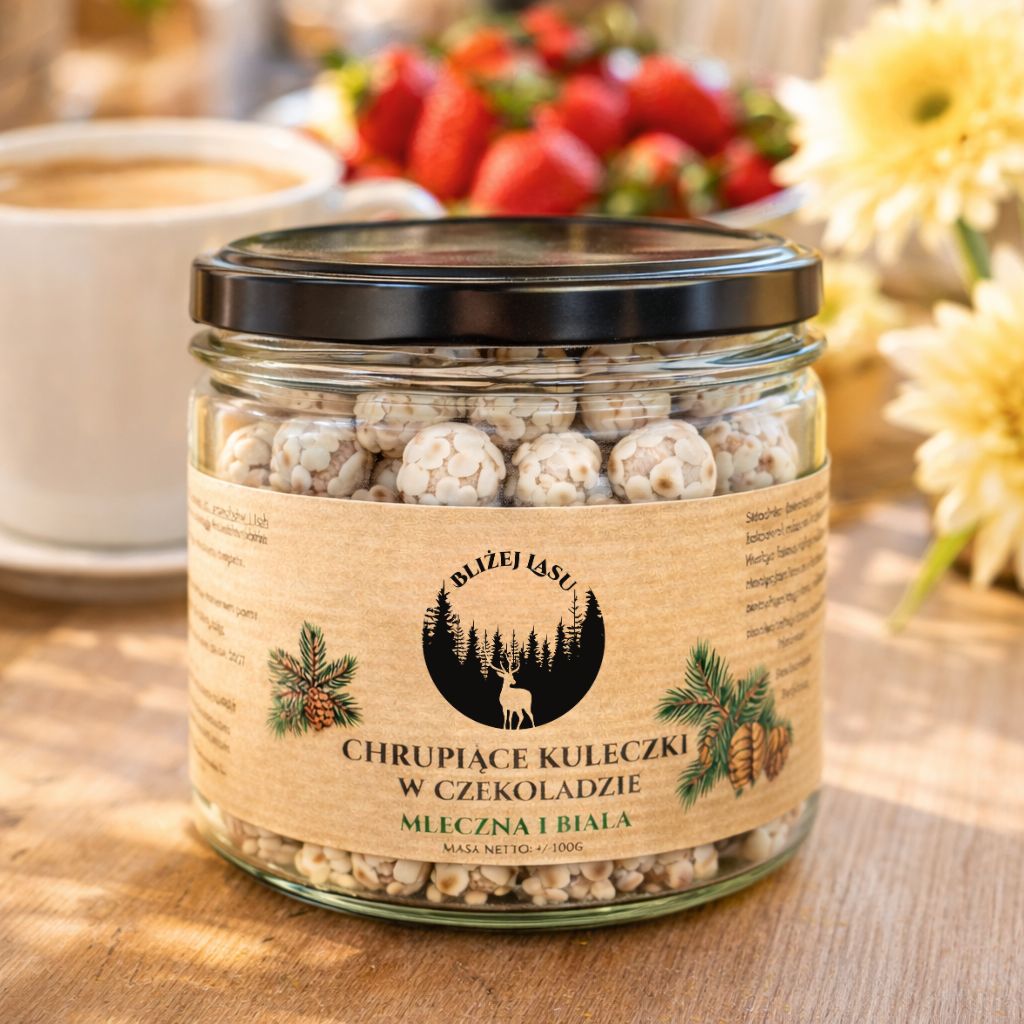 Delikatne wnętrze zbożowe łączy się tu z warstwą mlecznej i białej czekolady, tworząc lekką, chrupiącą przekąskę o przyjemnie słodkim smaku. Każda kuleczka to mały balans między lekkością a słodyczą.