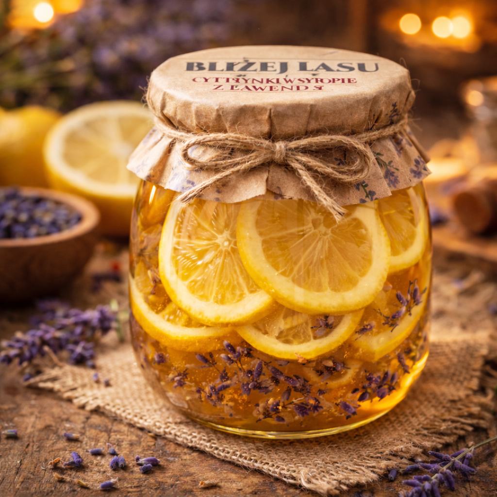 Cytryna w syropie z lawendy to harmonijne połączenie świeżej, cytrusowej wyrazistości z delikatnym, kwiatowym aromatem lawendy. Złociste plasterki cytryny zanurzone w gęstym syropie zachowują swoją naturalną świeżość, a jednocześnie zyskują aksamitną miękkość i subtelnie ziołowy charakter.