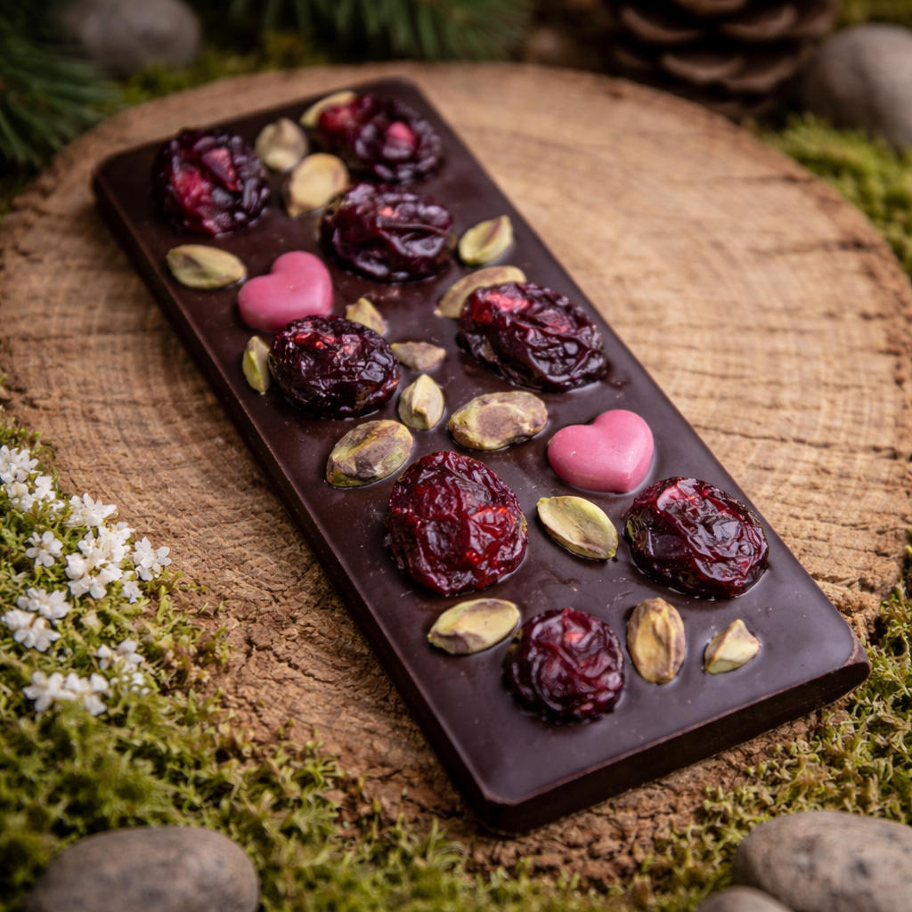 Deserowa czekolada ma głęboki, zdecydowany smak. Wiśnia dodaje jej lekkiej kwasowości i owocowej świeżości. Pistacja wprowadza subtelną nutę orzechową i przyjemną strukturę.