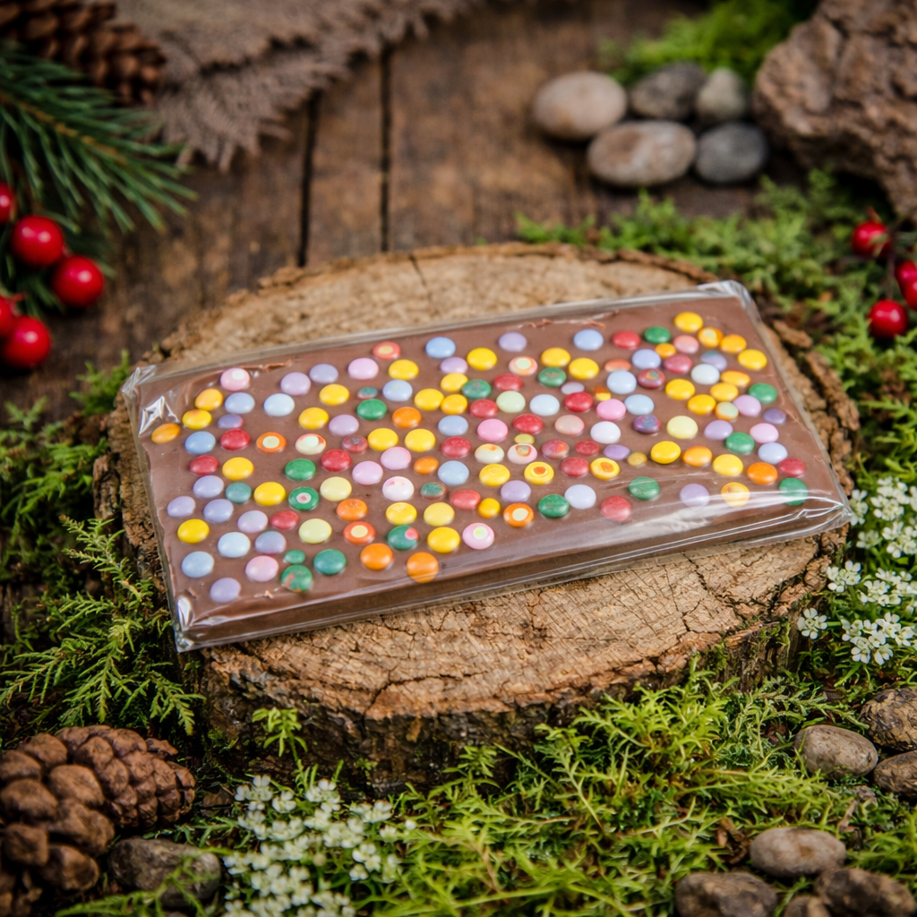 Delikatna mleczna czekolada udekorowana kolorowymi drażetkami. Radosna, słodka propozycja idealna na drobny upominek lub poprawę humoru.
