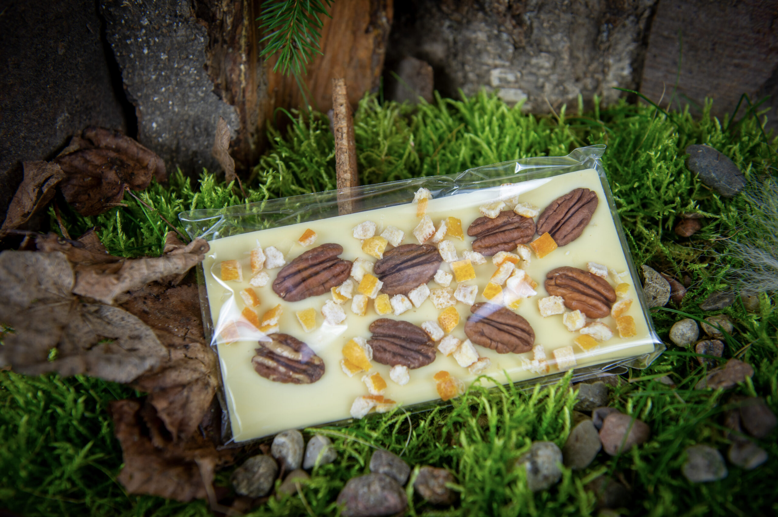 „Pekanowa Rozkosz z Pomarańczą” to czekolada, która przenosi nas w świat wyrafinowanych smaków i aromatów. Wyobraź sobie klasyczną, mleczną czekoladę, która rozpływa się w ustach, a w niej zatopione kawałki chrupiących orzechów pekan i delikatnie kandyzowanej skórki pomarańczowej.