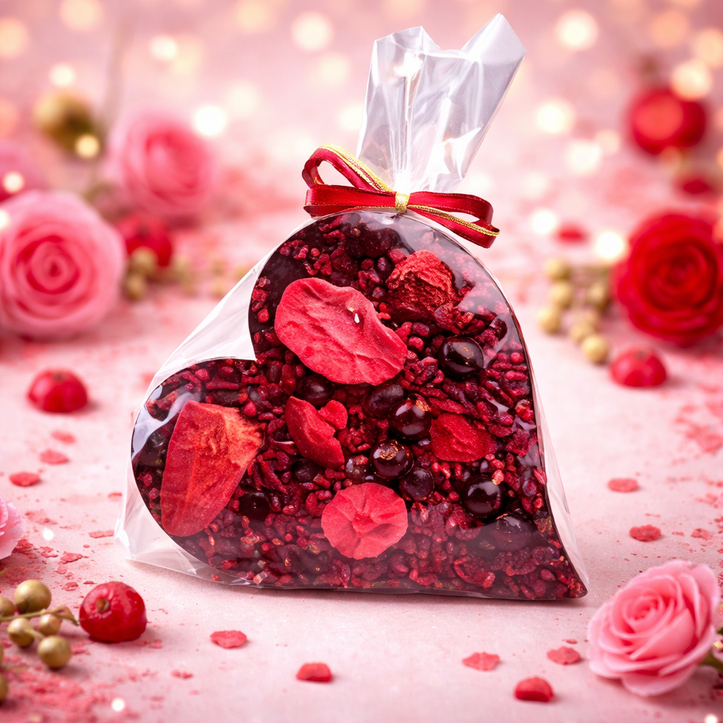 Serce z gorzkiej czekolady z dodatkiem truskawki, maliny i porzeczki to wyjątkowa propozycja dla osób, które cenią połączenie elegancji z naturalnym smakiem.