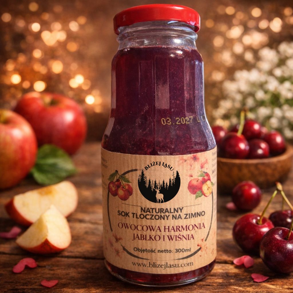 Owocowa Harmonia to naturalny sok tłoczony, który łączy delikatną słodycz jabłek z wyrazistym charakterem wiśni.