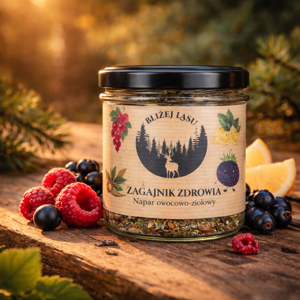 Zagajnik Zdrowia to wielowymiarowa mieszanka inspirowana naturą – jak spacer po leśnej polanie pełnej ziół, owoców i świeżego powietrza. Łączy kojące właściwości melisy i rumianku z intensywnością owoców leśnych oraz subtelną energią yerba mate.